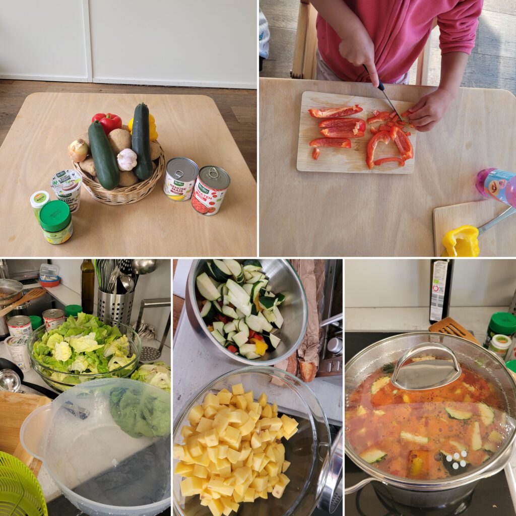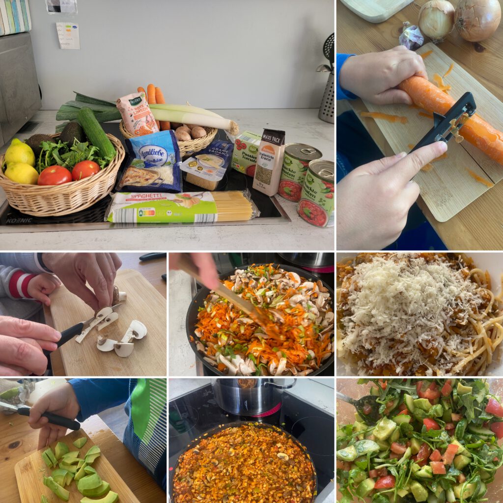 Eltern und Kinder entdecken den Spaß daran, gemeinsam gesunde, kostengünstige Mahlzeiten zu kochen und zu genießen. Die Gerichte sind überwiegend vegetarisch und werden wöchentlich miteinander geplant. Nach Absprache gibt es gelegentlich Fisch oder Fleischgerichte.