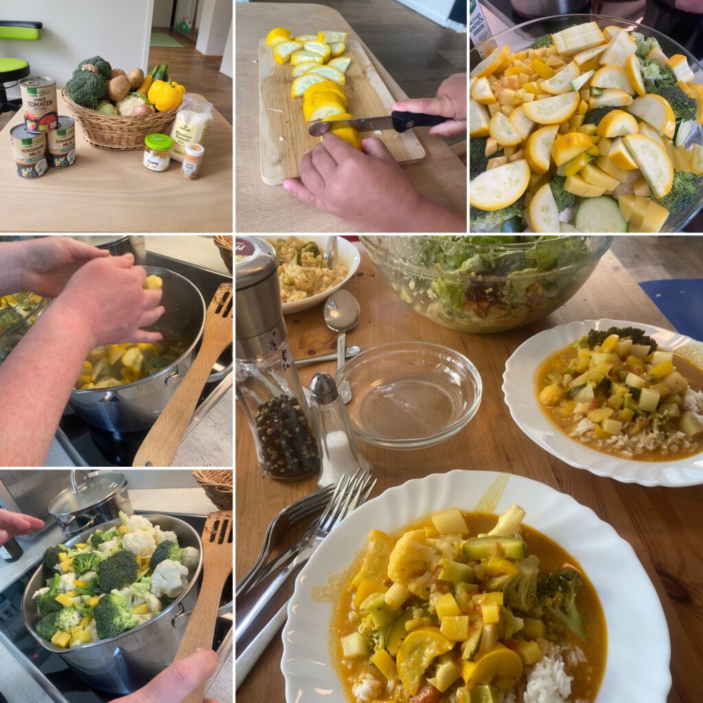 22.02.2024 | Winterliches Gemüse-Curry (vegan) (wurde gewünscht von den Teilnehmenden der letzen Woche) Materialkosten pro Person: 1 Euro Für 4 Personen Zutaten: – 2 Tassen Reis (Langkorn oder Basmati) – 1 Zwiebel – 1 Lauch – 250g Karotten – 250g Steckrübe – 250g Petersilienwurzel – 250g Spitzkohl – 400ml Kokosmilch – etwas Öl zum Anbraten – gelbe Currypaste – Brühe – Salz – Pfeffer Rezept: 1. Gemüse schälen und klein schneiden. Zwiebel schälen und klein schneiden. 2. Reis nach Packungsanweisung kochen. 3. Öl in einer großen Pfanne oder in einem großen Topf erhitzen, Zwiebeln hinzugeben und glasig andünsten. Dann das kleingeschnittene Gemüse dazugeben und eine Weile anbraten. Immer wieder umrühren. 4. Currypaste hinzugeben und kurz mit anbraten. 5. Die Kokosmilch zum Gemüse geben und mit Wasser auffüllen, bis das Gemüse leicht bedeckt ist. Zum Kochen bringen, dann die Brühe hinzugeben. Wenn es kocht auf mittlere Hitze runterstellen. 6. 15-20 Minuten köcheln lassen, immer wieder umrühren. Nach 15 Minuten Gemüse probieren, das Gemüse sollte mindestens bissfest sein, kann auch weicher gekocht werden. 7. Das Curry mit Salz und Pfeffer abschmecken. 8. Das Curry mit dem Reis servieren. | ![]() ![]() |