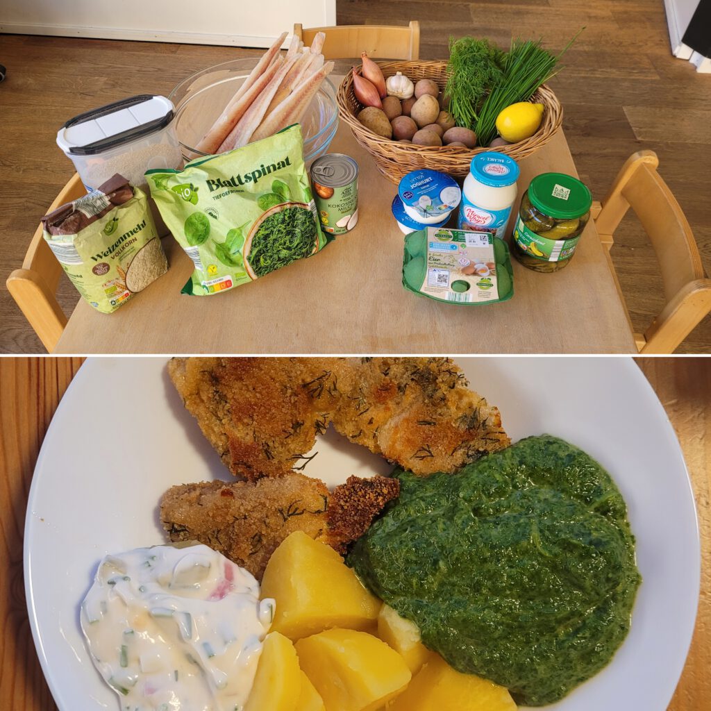 15.01.2026 selbstgemachte Fischstäbchen mit Salzkartoffeln, Spinat und Remoulade
