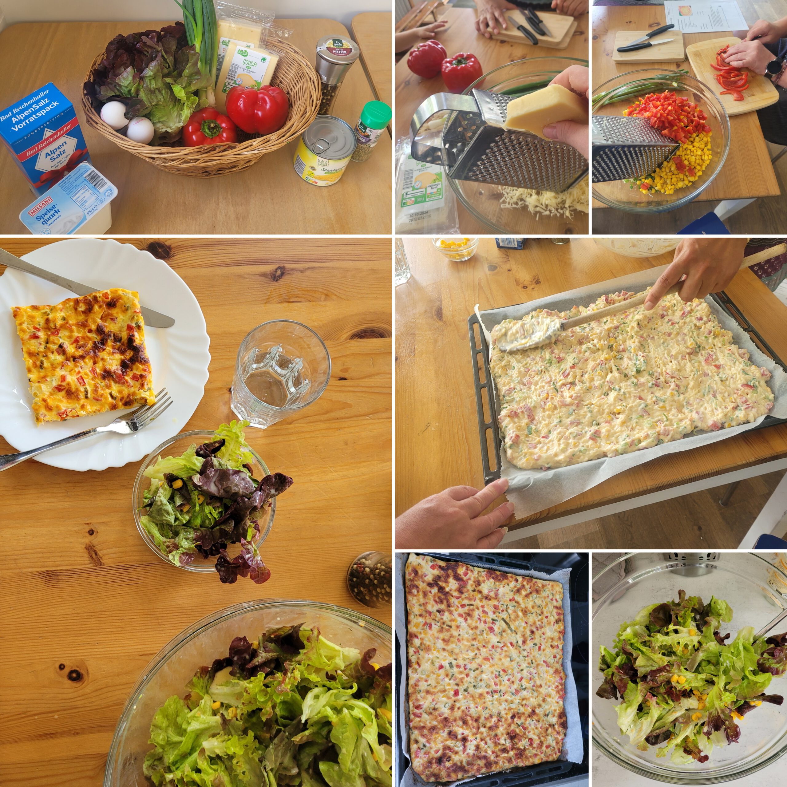 | 04.07.24 | Tortilla mit Gemüse und Salat Materialkosten pro Person: 1,00€ Für 4 Personen: Zutaten: – 750g Kartoffeln – 100g Champignons – 1 Paprika – 1 Zucchini – 1 Bund Frühlingszwiebeln – Olivenöl zum Braten – Salz – Pfeffer – 80g geriebener Käse nach Wahl (Bergkäse, Manchego oder Appenzeller) Rezept: 1. Heize den Ofen auf 180°C Ober-/Unterhitze (Umluft: 160°C) vor. Wasche und putze die Champignons, die Paprika, die Zucchini und die Frühlingszwiebeln. Schäle die Kartoffeln und schneide sie in dünne, feine Scheiben. Das restliche Gemüse auch in feine Streifen schneiden und in einer Schüssel beiseite stellen. 2. Brate die Kartoffelscheiben in einer ofenfesten Pfanne mit etwas Olivenöl ca. 10 Minuten an, bis sie weich werden. Gib nun das restliche Gemüse dazu und brate es weitere 10 Minuten mit an. Rühre gelegentlich um und würze das Ganze mit Salz und Pfeffer. 3. Jetzt die Eier in einer separaten Schüssel aufschlagen und mit einem Schneebesen zu einer homogenen Masse verrühren. Gib dann den geriebenen Käse zur Eimasse und hebe ihn unter. Nun das Kartoffel-Gemüse-Gemisch in die Eimasse geben und alles miteinander vermengen. 4. Die Ei-Kartoffel-Gemüse-Käse-Masse in eine heiße Pfanne geben. Darauf achten, dass das Gemisch eine gleichmäßige Fläche ergibt. Das Ganze für 10 Minuten braten und nicht wenden. 5. Die Bratpfanne in den Ofen stellen und ca. 30 Minuten backen, bis eine goldbraune Kruste entsteht. Danach aus dem Ofen nehmen, kurz abkühlen lassen und mit dem Salat servieren. Rezept für den Salat siehe 13.06.24 | ![]() ![]() |