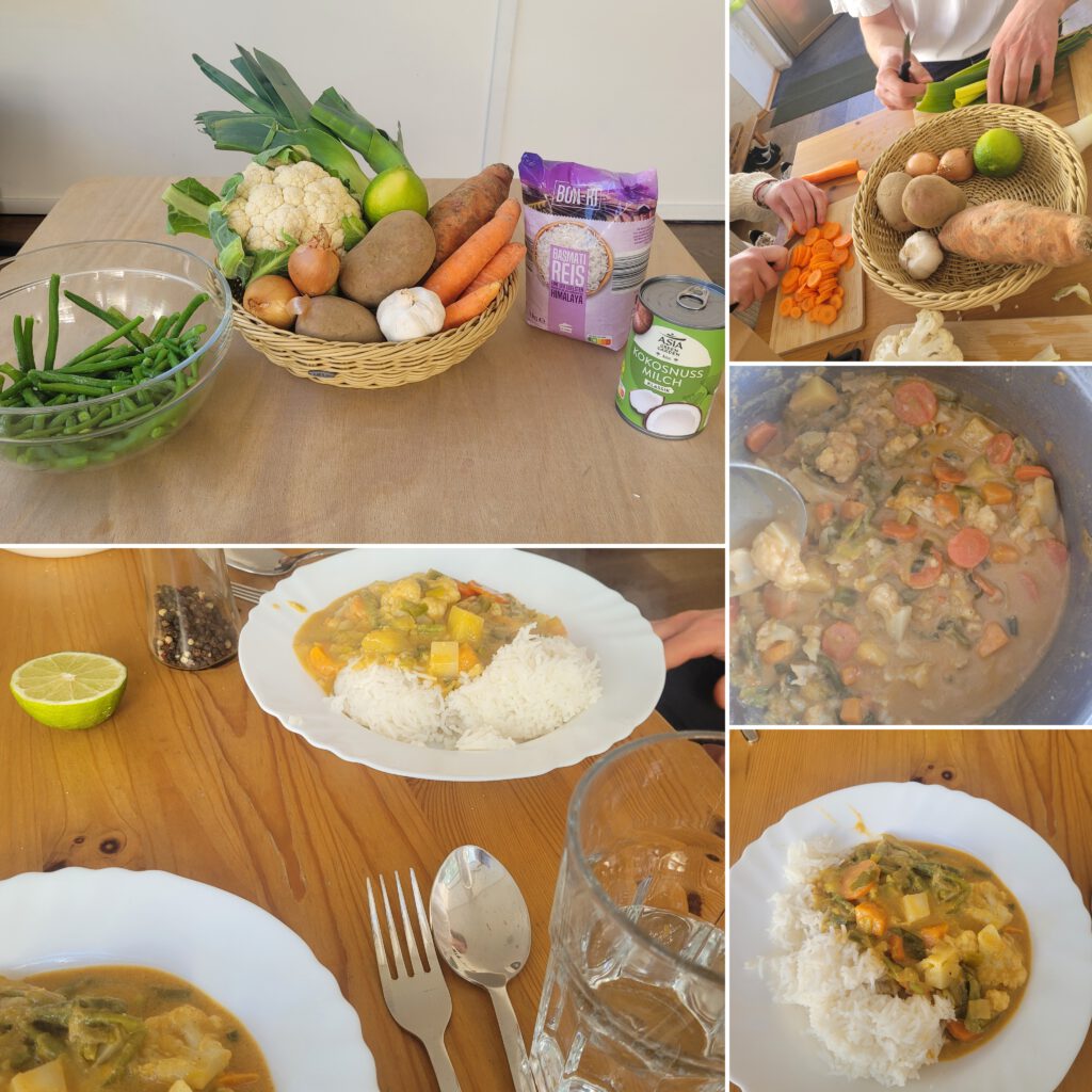 | 22.02.2024 | Winterliches Gemüse-Curry (vegan) (wurde gewünscht von den Teilnehmenden der letzen Woche) Materialkosten pro Person: 1 Euro Für 4 Personen Zutaten: – 2 Tassen Reis (Langkorn oder Basmati) – 1 Zwiebel – 1 Lauch – 250g Karotten – 250g Steckrübe – 250g Petersilienwurzel – 250g Spitzkohl – 400ml Kokosmilch – etwas Öl zum Anbraten – gelbe Currypaste – Brühe – Salz – Pfeffer Rezept: 1. Gemüse schälen und klein schneiden. Zwiebel schälen und klein schneiden. 2. Reis nach Packungsanweisung kochen. 3. Öl in einer großen Pfanne oder in einem großen Topf erhitzen, Zwiebeln hinzugeben und glasig andünsten. Dann das kleingeschnittene Gemüse dazugeben und eine Weile anbraten. Immer wieder umrühren. 4. Currypaste hinzugeben und kurz mit anbraten. 5. Die Kokosmilch zum Gemüse geben und mit Wasser auffüllen, bis das Gemüse leicht bedeckt ist. Zum Kochen bringen, dann die Brühe hinzugeben. Wenn es kocht auf mittlere Hitze runterstellen. 6. 15-20 Minuten köcheln lassen, immer wieder umrühren. Nach 15 Minuten Gemüse probieren, das Gemüse sollte mindestens bissfest sein, kann auch weicher gekocht werden. 7. Das Curry mit Salz und Pfeffer abschmecken. 8. Das Curry mit dem Reis servieren. | ![]() ![]() |